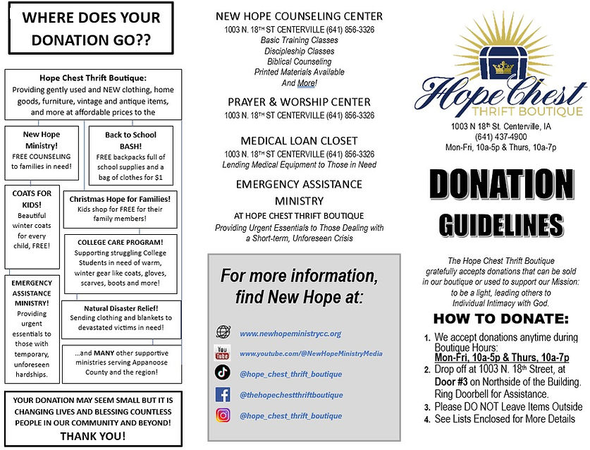 We are looking for men and women who feel called to serve the Lord in ministry supporting various areas in the Hope Chest Thrift Boutique from the front store staff to the warehouse. If you feel a nudging from the Holy Spirit to inquire, contact the Director at 641-437-4900 for more information and to fill out an application.
